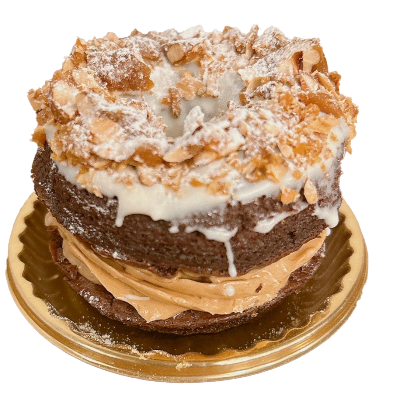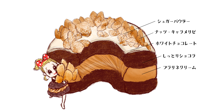 PLALINE RICH CHOCOLAT プラリネリッチショコラ プラリネクリームと、トップにホワイトチョコをコーティングして、ローストナッツのキャラメリゼをトッピングした華やかなドーナツ。 前のページへ